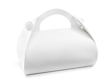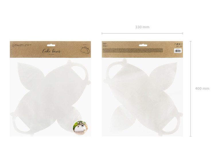 Ozdobne pudełka na ciasto, wykonane z białego papieru. Wymiary po złożeniu ok. 16 x 8,5 x 9,5 cm.(1 karton / 50 op.)(1 op. / 10 szt.)