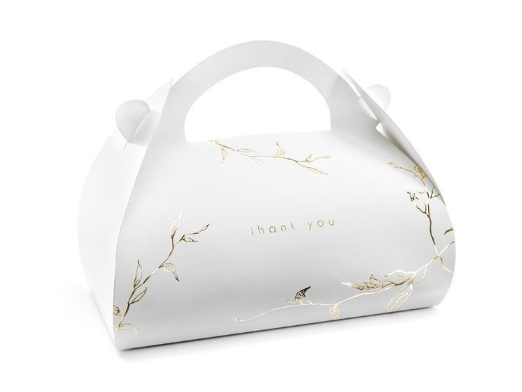 Ozdobne pudełka na ciasto, wykonane z białego papieru ze złotym metalizowanym wzorem gałązek.