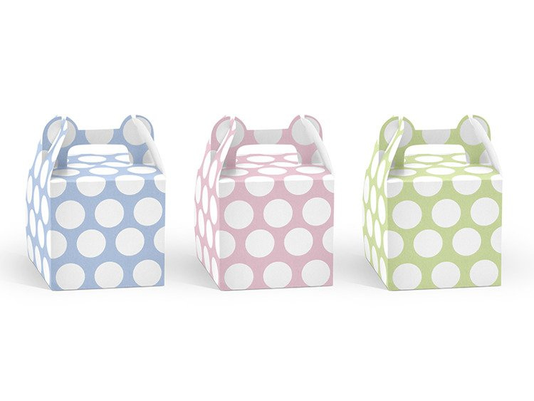Ozdobne pudełka na słodycze Pastelove, wykonane z papieru, z nadrukiem, mix wzorów, wymiary po złożeniu ok. 8,7x8,7x12,5 cm.(1 karton / 30 op.)(1 op. / 6 szt.)