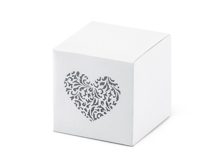 Pudełeczka z ornamentowym sercem wykonane z papieru w kolorze białym perłowym, kwadratowe.