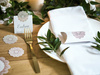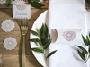 Pudełeczka z papieru w kolorze białym perłowym z ornamentową rozetą.