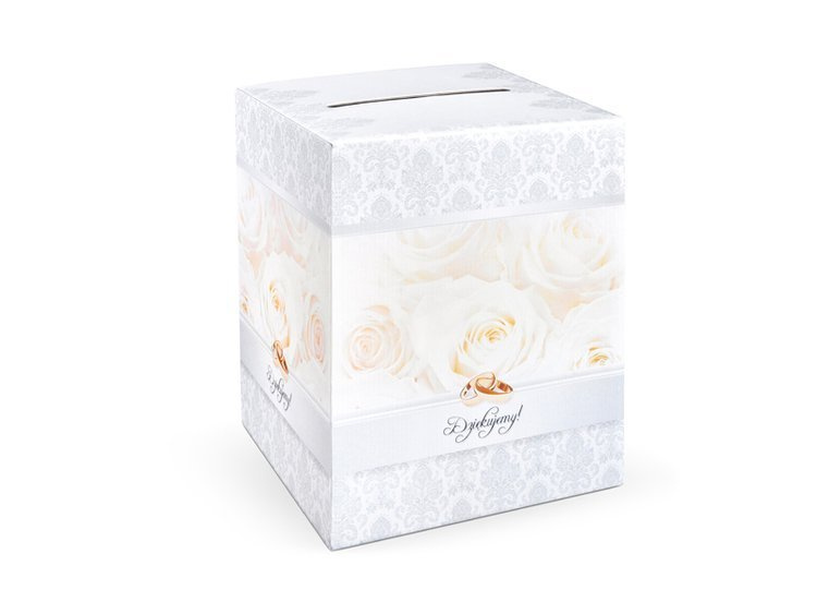 Pudełko na telegramy z papieru ze srebrnym nadrukiem i z napisem Dziękujemy!