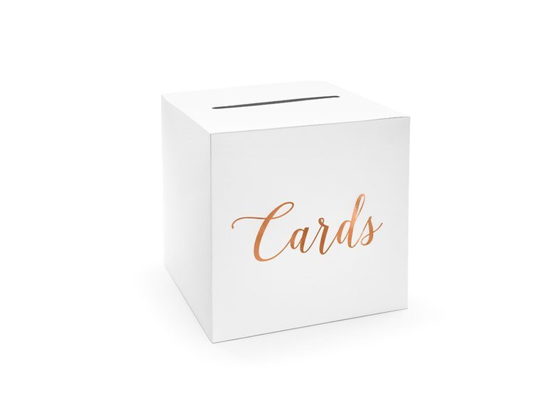 Pudełko na koperty wykonane z białego papieru z metalizowanym napisem Cards w kolorze różowego złota.