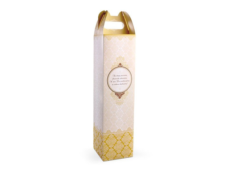 Pudełka na alkohol z papieru ze złotym nadrukiem i wierszykiem, wymiary po złożeniu 8x8x29 centymetrów.(1 karton / 20 op.)(1 op. / 10 szt.)