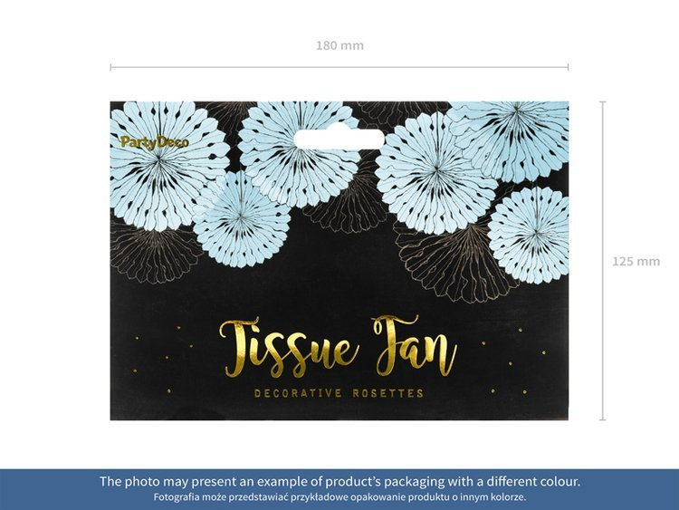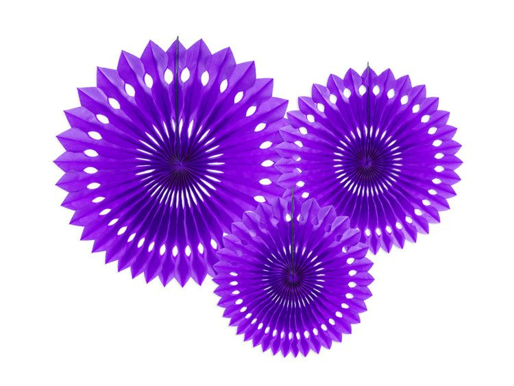 Rozety dekoracyjne wykonane z bibuły w kolorze fioletowym, średnice po złożeniu ok. 20 cm, 25 cm i 30 cm.(1 karton / 50 op.)(1 op. / 3 szt.)