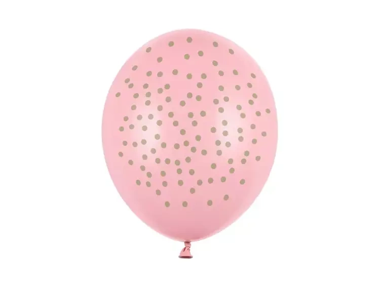 Balony lateksowe jasnoróżowe z nadrukiem złotych kropek.