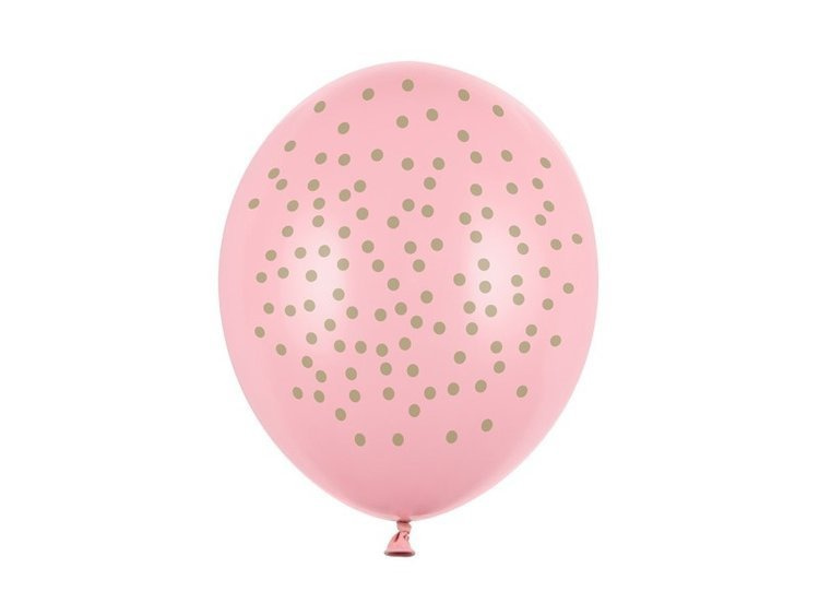 Balony lateksowe jasnoróżowe z nadrukiem złotych kropek.