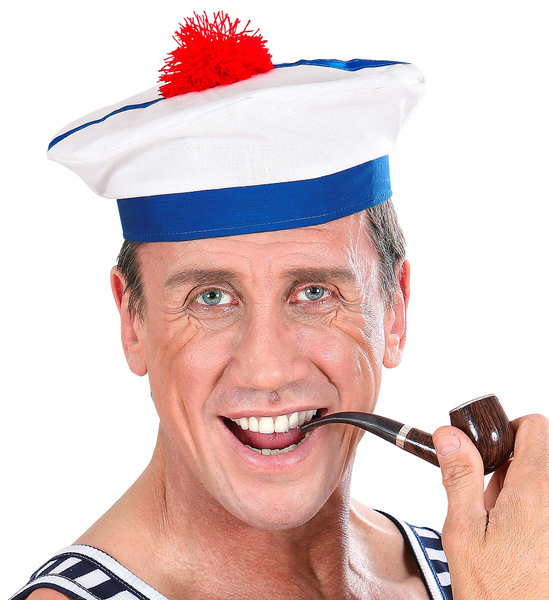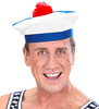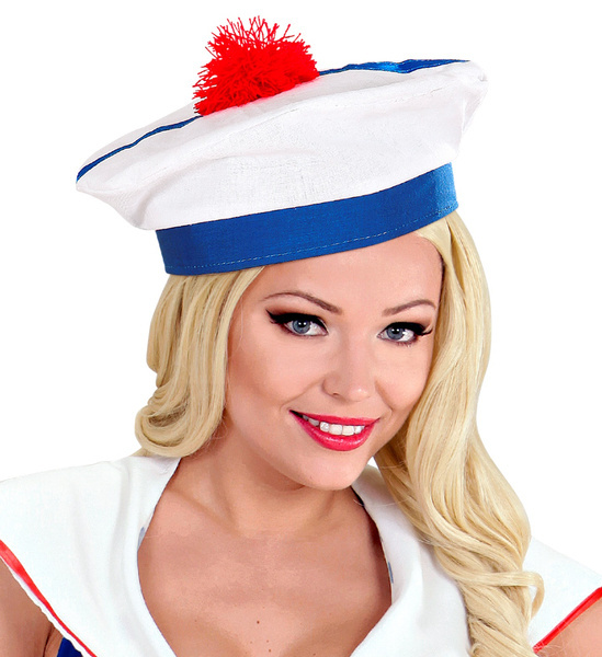 Czapka majtka wykonana z granatowo-białego materiału, obszyta granatową lamówką.