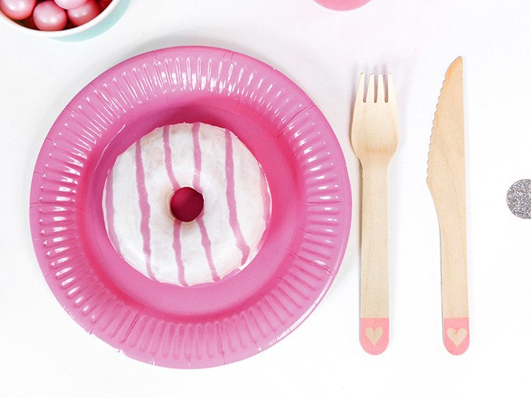 Sztućce drewniane Serca z nadrukiem w kolorze rumianoróżowym.