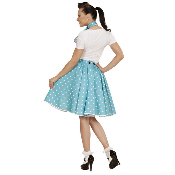 Spódniczka jak i apaszka w kolorze niebieskim w białe grochy.