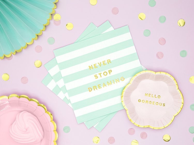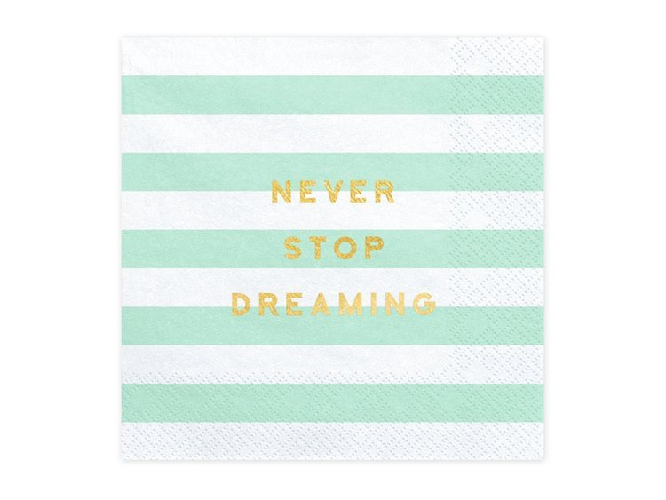 Serwetki papierowe Yummy, mix kolorów (biały i miętowy) ze złotym napisem Never stop dreaming, wymiary po rozłożeniu ok. 33 x 33 cm, wymiary po złożeniu ok. 16,5 x 16,5 cm.(1 op. / 20 szt.)