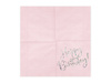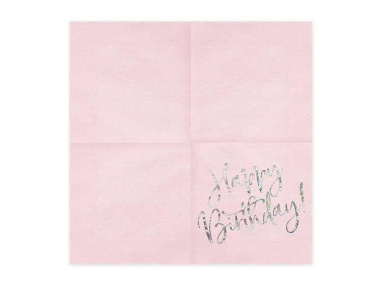 Serwetki papierowe w kolorze jasnego pudrowego różu z holograficznym napisem Happy Birthday, wymiary po rozłożeniu ok. 33 x 33 cm, wymiary po złożeniu ok. 16,5 x 16,5 cm. (1 op. / 20 szt.)