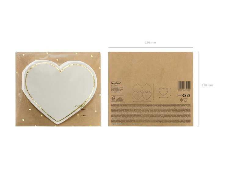 Serwetki papierowe w kształcie serca w kolorze białym z metalizowanym złotym nadrukiem.