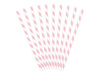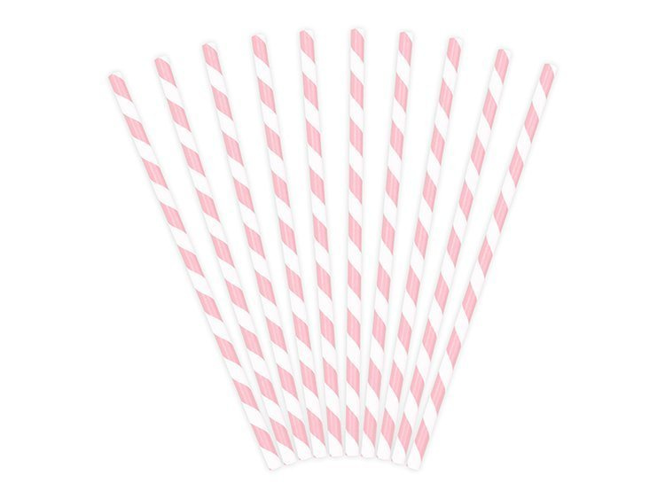 Słomki papierowe w kolorze jasnoróżowym z białymi ukośnymi paskami.
