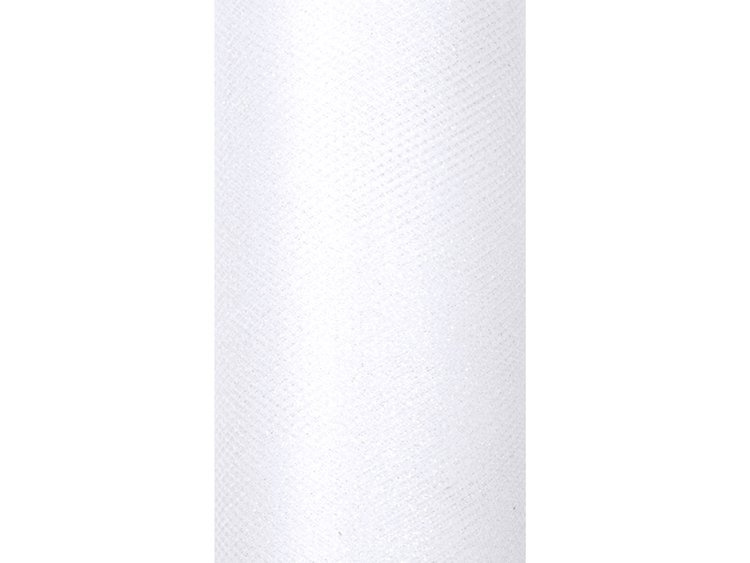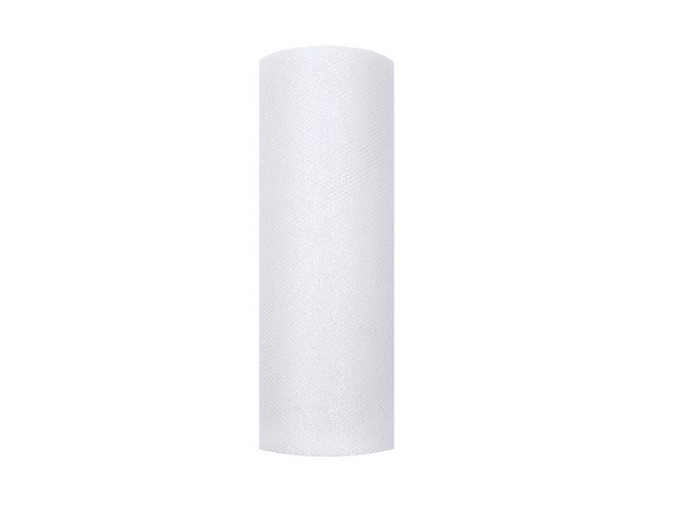Tiul o drobnych oczkach, zdobiony brokatem, nawinięty na szpulkę.
