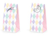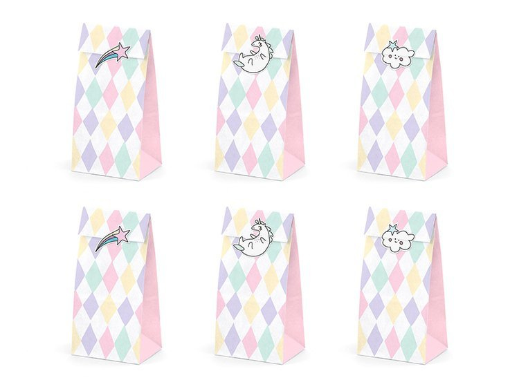 Torebki na słodycze Jednorożec, zestaw zawiera 6 torebek z nadrukiem i 6 naklejek, wymiary po złożeniu ok. 8 x 18 x 6 cm.(1 karton / 50 op.)(1 op. / 6 szt.)