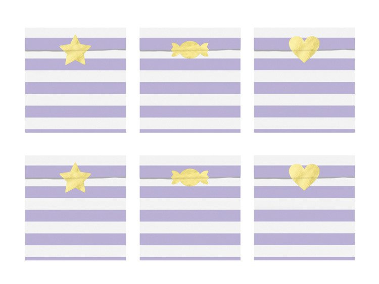 Torebki na słodycze Yummy, w kolorze jasnoliliowym, zestaw zawiera 6 torebek z nadrukiem i 6 naklejek, wymiary po złożeniu ok. 13 x 14 cm. (1 karton / 50 op.)(1 op. / 6 szt.)