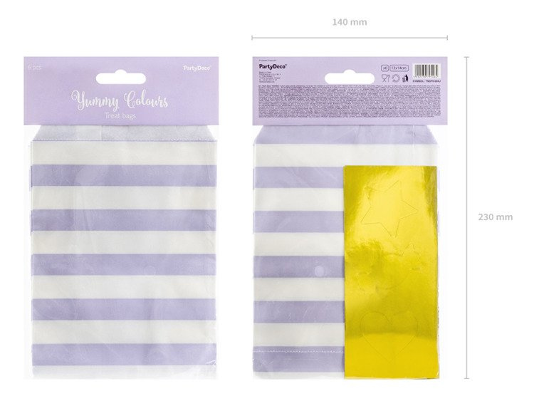 Torebki na słodycze Yummy, w kolorze jasnoliliowym, zestaw zawiera 6 torebek z nadrukiem i 6 naklejek, wymiary po złożeniu ok. 13 x 14 cm. (1 karton / 50 op.)(1 op. / 6 szt.)