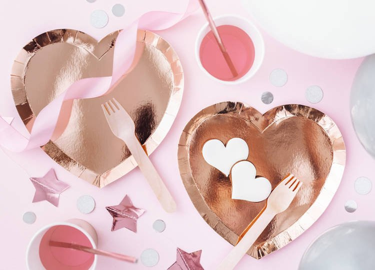 Błyszczące papierowe talerzyki w kształcie serca w kolorze różowego złota.