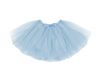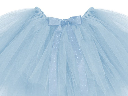 Spódnica Tutu w kolorze błękitnym z tasiemką w kolorze gołębim w białe kropki, obwód w pasie około 60 centymetrów, długość około 30 centymetrów.