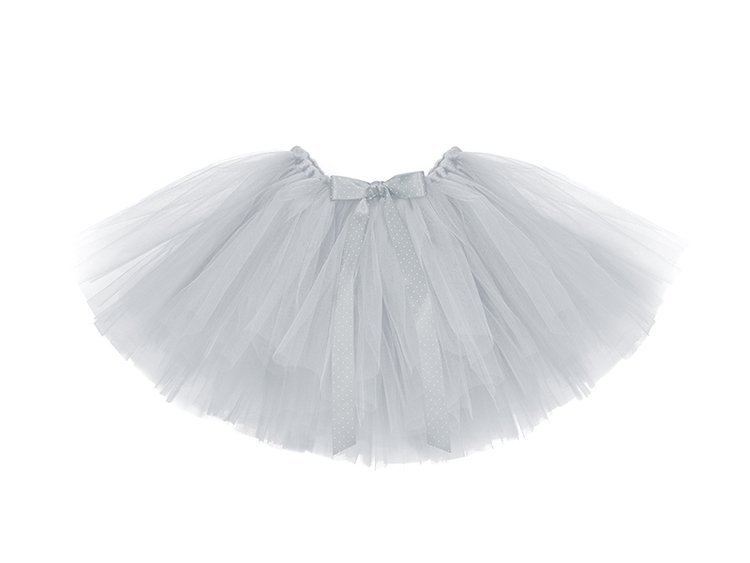 Spódnica Tutu w kolorze szarym ze srebrną tasiemką w białe kropki, obwód w pasie około 60 centymetrów, długość około 30 centymetrów.