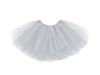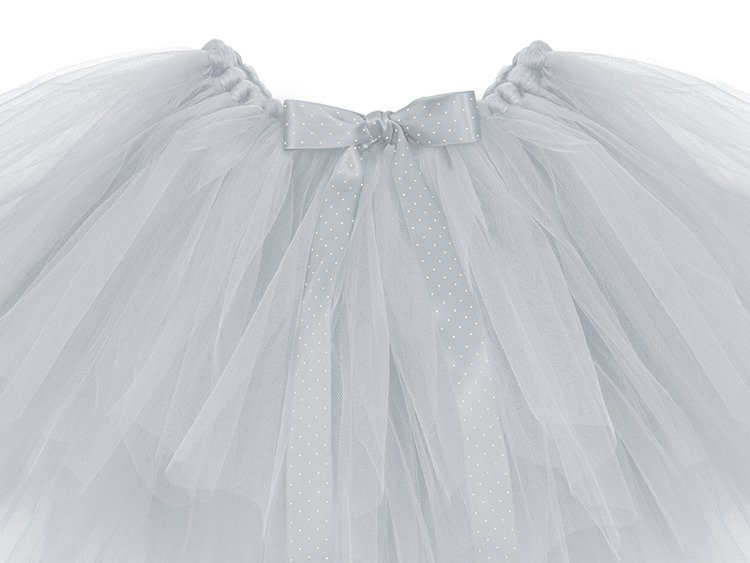 Spódnica Tutu w kolorze szarym ze srebrną tasiemką w białe kropki, obwód w pasie około 60 centymetrów, długość około 30 centymetrów.