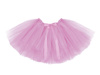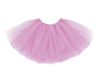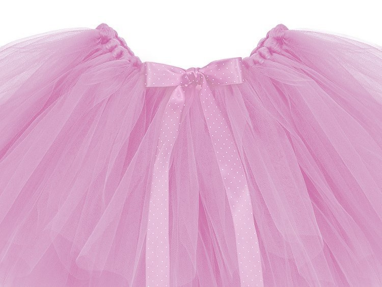 Spódnica Tutu w kolorze jasnoróżowym z jasnoróżową tasiemką w białe kropki, obwód w pasie około 80 centymetrów, długość około 34 centymetrów.
