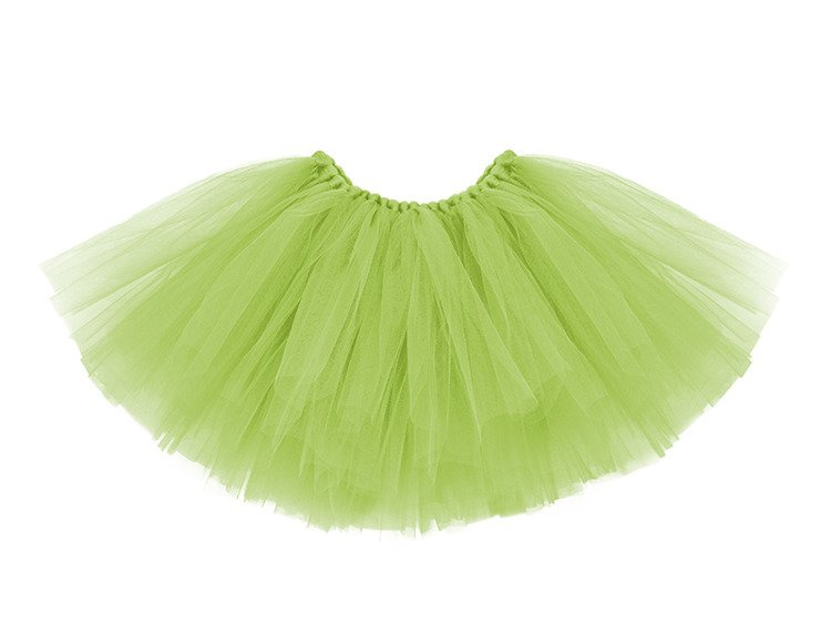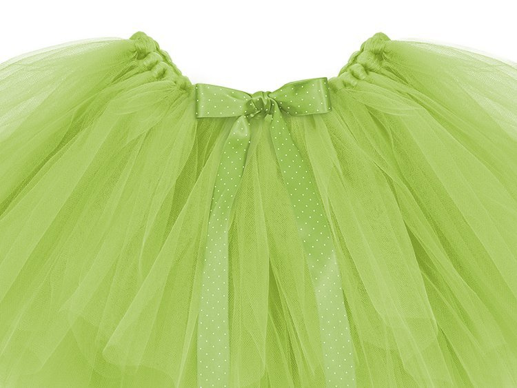 Spódnica Tutu w kolorze jasnozielonym z tasiemką w kolorze zielonego jabłuszka w białe kropki, obwód w pasie około 80 centymetrów, długość około 34 centymetrów.