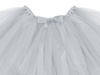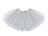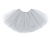 Spódnica Tutu w kolorze szarym ze srebrną tasiemką w białe kropki, obwód w pasie około 95 centymetrów, długość około 36 centymetrów.