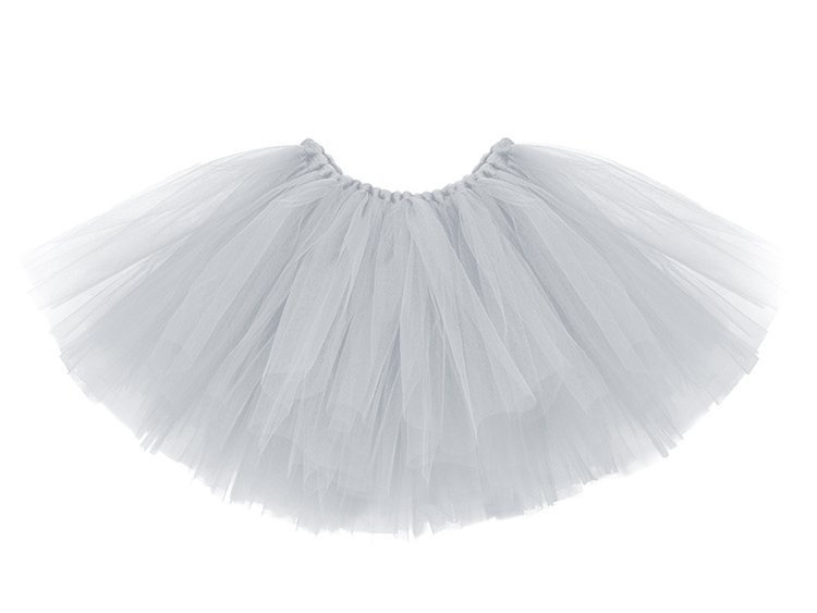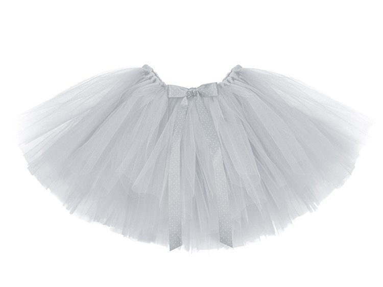 Spódnica Tutu w kolorze szarym ze srebrną tasiemką w białe kropki, obwód w pasie około 95 centymetrów, długość około 36 centymetrów.(1 karton / 6 szt.)