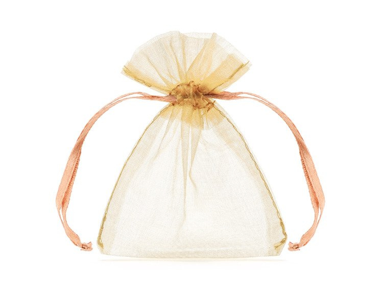 Ściągane woreczki z gładkiej organzy w kolorze łososiowym, wymiary 7,5x10 centymetrów. Idealne dla gości weselnych.(1 karton / 50 op.)(1 op. / 20 szt.)