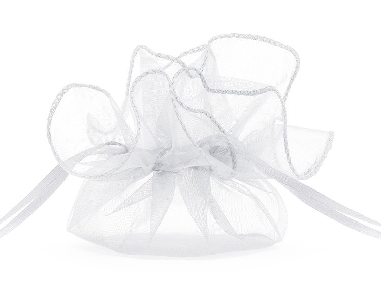 Ściągane woreczki z gładkiej organzy w kolorze białym.