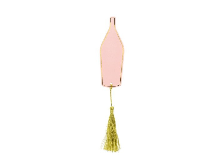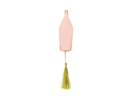 Wizytówki na stół z papieru w kolorze różowym ze złotym nadrukiem i złotymi frędzlami, wymiary butelki ok. 3,5 x 10 cm, wymiary butelki z frędzlem ok. 3,5 x 16 cm.(1 karton / 50 op.)(1 op. / 6 szt.)