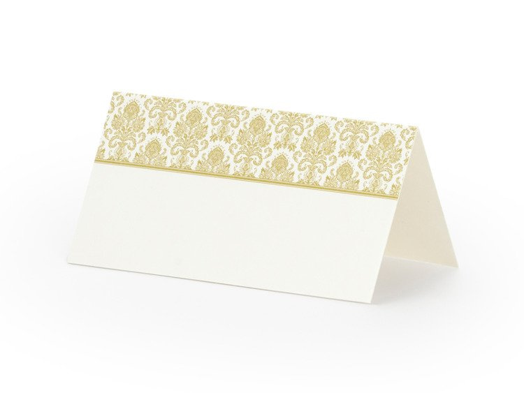 Wizytówki na stół wykonane z papieru w kolorze białym, ze złotym wzorem.