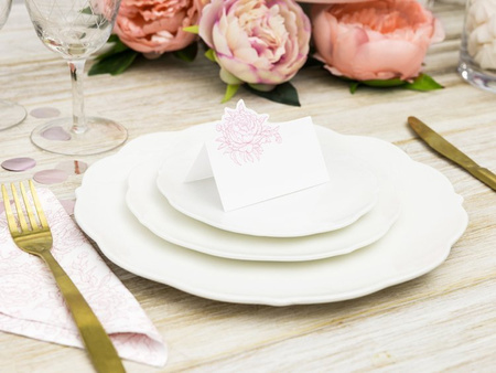 Wizytówki na stół Piwonie, białe z wzorem w kolorze brudnego różu, wymiary ok. 9 x 4,5 cm. (1 karton / 40 op.)(1 op. / 10 szt.)