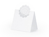 Wizytówki na stół wykonane z perłowego papieru w kolorze białym, z wyciętym wzorem rozety.