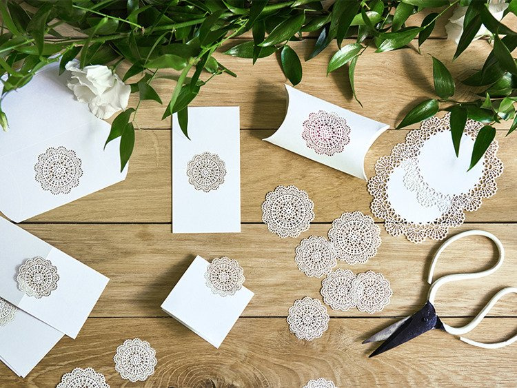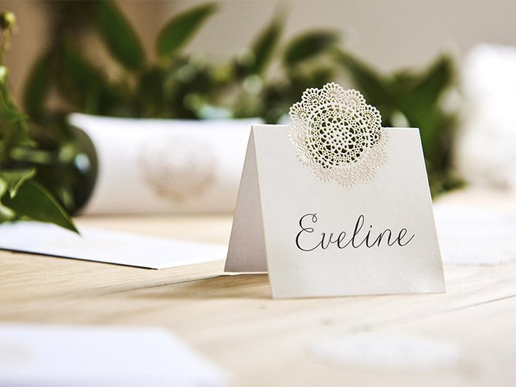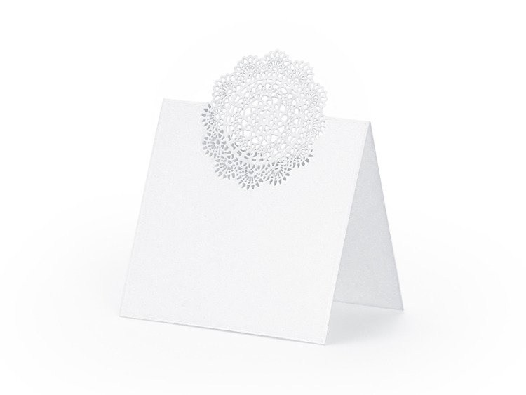 Wizytówki na stół Rozeta z perłowego papieru w kolorze białym, z wyciętym wzorem, wymiary 6,3x6 centymetrów.(1 karton / 50 op.)(1 op. / 10 szt.)