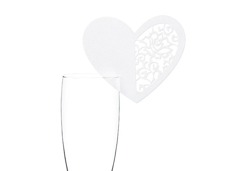 Wizytówki na kieliszki Serce z perłowego papieru w kolorze białym, z wyciętym wzorem, wymiary 9,5x8 centymetrów.(1 karton / 50 op.)(1 op. / 10 szt.)
