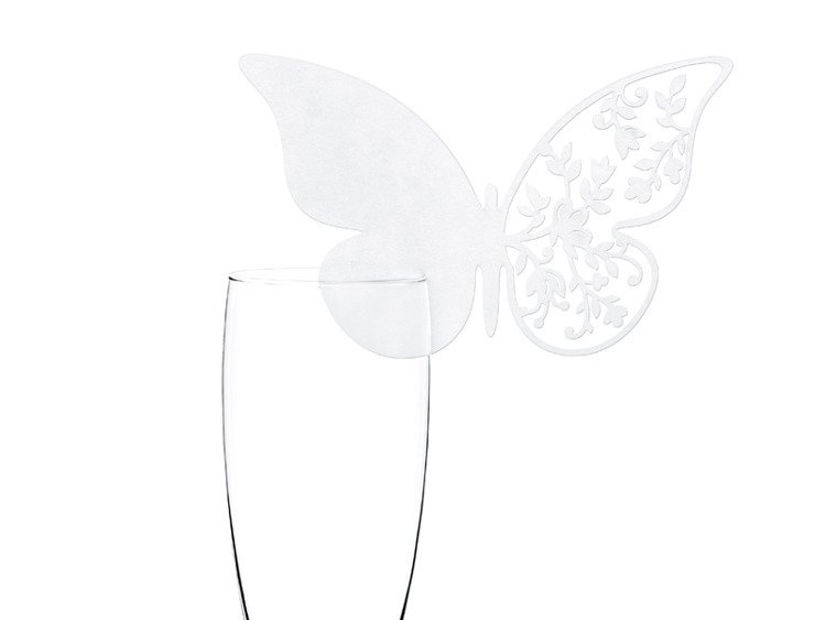 Wizytówki na kieliszki Motyl z perłowego papieru w kolorze białym, z wyciętym wzorem, wymiary 12,5x7,6 centymetra.(1 karton / 50 op.)(1 op. / 10 szt.)