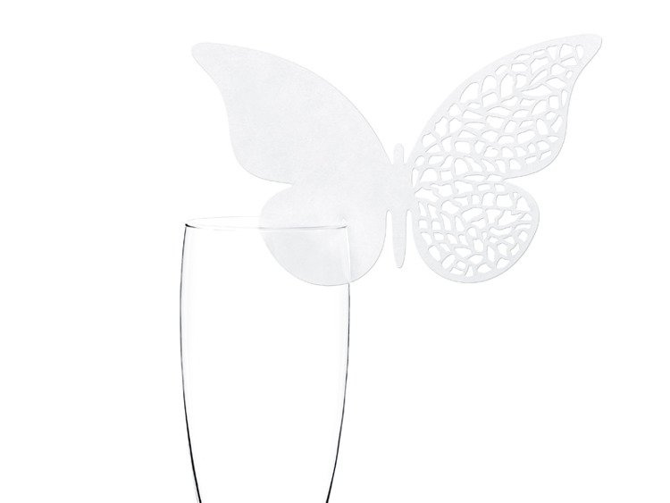 Wizytówki na kieliszki Motyl z perłowego papieru w kolorze białym, z wyciętym wzorem, wymiary 12,5x7,6 centymetra.(1 op. / 10 szt.)