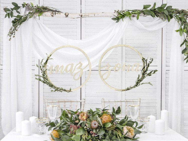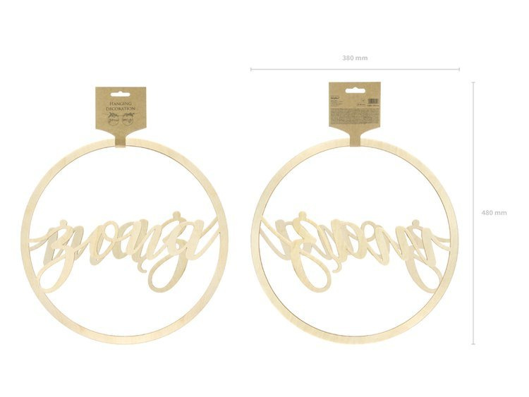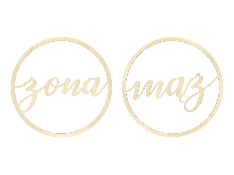 Zawieszki dekoracyjne wykonane z drewna, zestaw zawiera zawieszkę z napisem Żona oraz zawieszkę z napisem Mąż, średnica ok. 38 cm.(1 karton / 10 op.)(1 op. / 2 szt.)