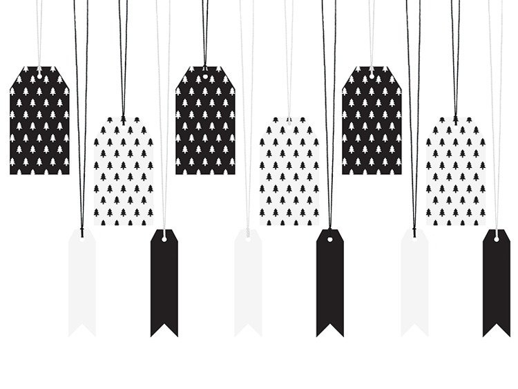 Zawieszki do prezentów Choinki z czarnym i białym sznureczkiem, opakowanie zawiera zawieszki o wymiarach ok.: 1,8x7 cm i 3,9x7 cm.(1 karton / 40 op.)(1 op. / 12 szt.)