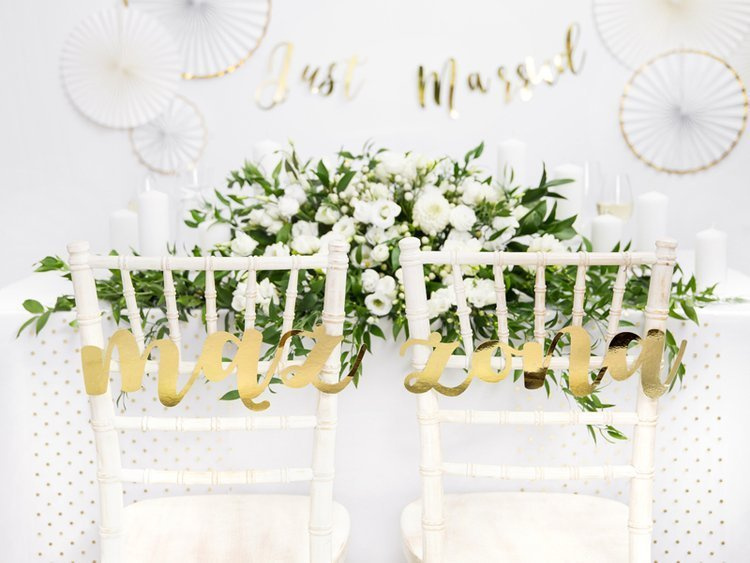 Zawieszki na krzesło Żona i Mąż, w kolorze złotym metalizowanym.