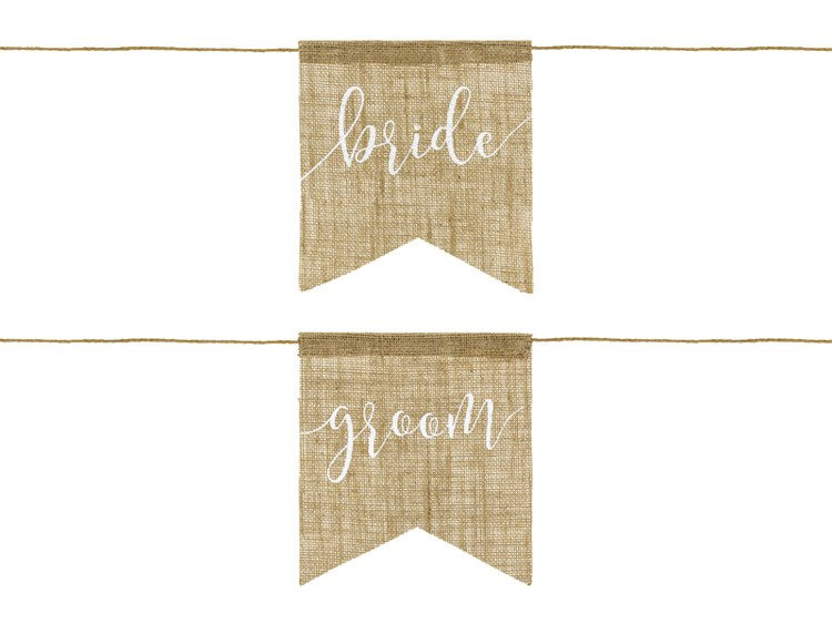 Zawieszki na krzesło wykonane z juty z białymi napisami Bride i Groom, wymiary ok. 20 x 22 cm.(1 karton / 50 op.)(1 op. / 2 szt.)