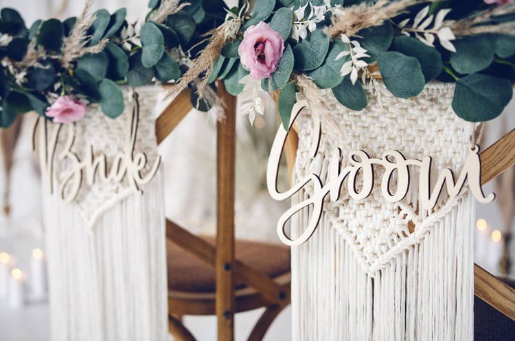 Drewniane zawieszki na krzesła Bride i Groom, wymiary ok. 25.5 x 16 cm (Bride) i ok. 27.5 x 17.5 cm (Groom).(1 karton / 12 op.)(1 op. / 2 szt.)