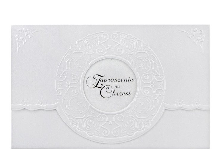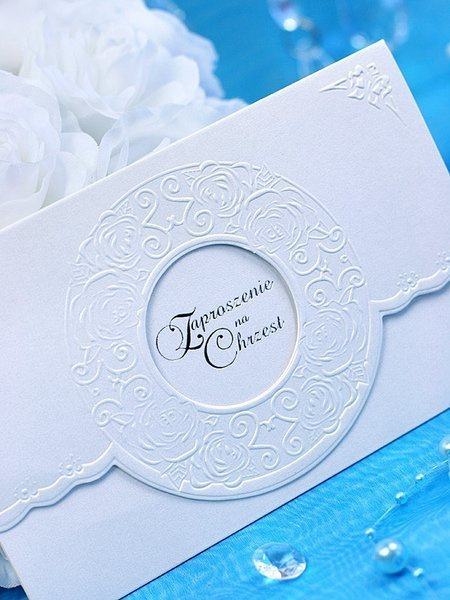 Zaproszenia na chrzest w kolorze perłowym z ozdobnym tłoczeniem.