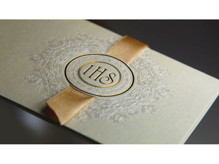 Zaproszenia komunijne ze złotą wstążką, w zestawie z kopertami.(1 karton / 50 op.)(1 op. / 10 szt.)