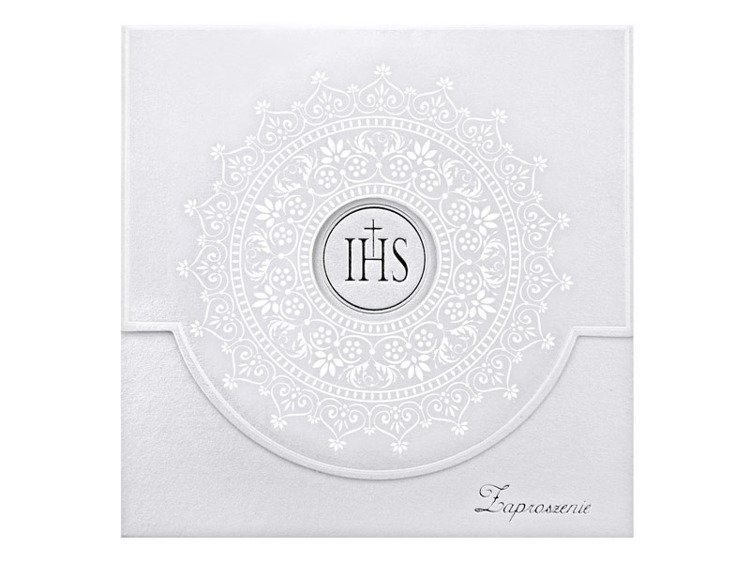 Zaproszenia komunijne w kolorze białym z ornamentem.