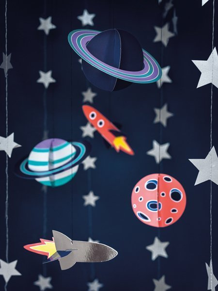 Zawieszki dekoracyjne Kosmos wykonane z papieru, do samodzielnego złożenia, zestaw zawiera 5 zawieszek, wymiary po złożeniu od ok. 17 x 10 cm do ok. 19 x 7 cm.(1 karton / 40 op.)(1 op. / 5 szt.)