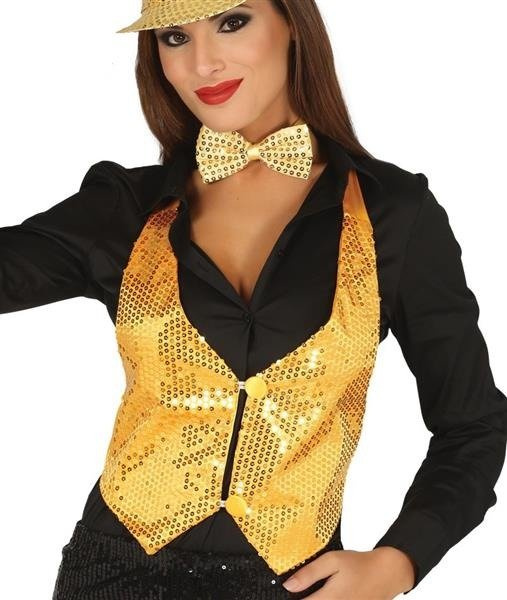 Przód kamizelki pokryty złotymi cekinami.
